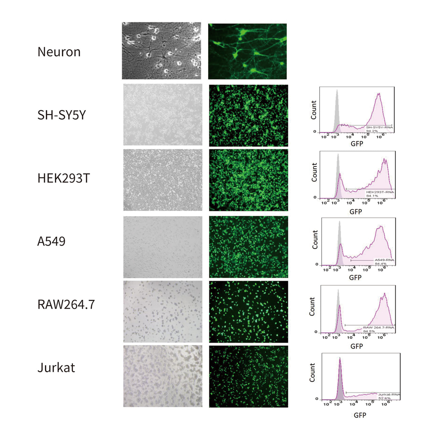 Cells were transfected with GFP plasmid or mRNA using UniquePOKE®, and cell viability and transfection efficiency were evaluated 24–48 hours post-transfection.